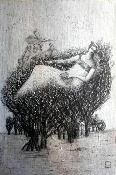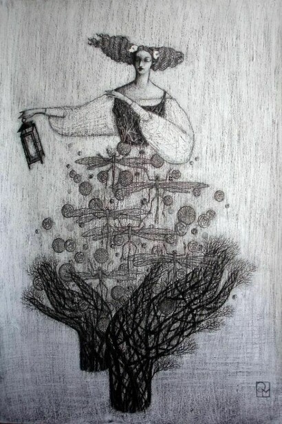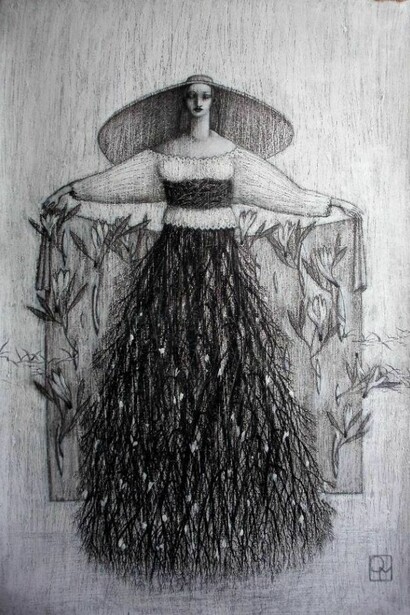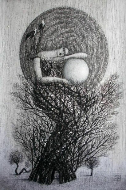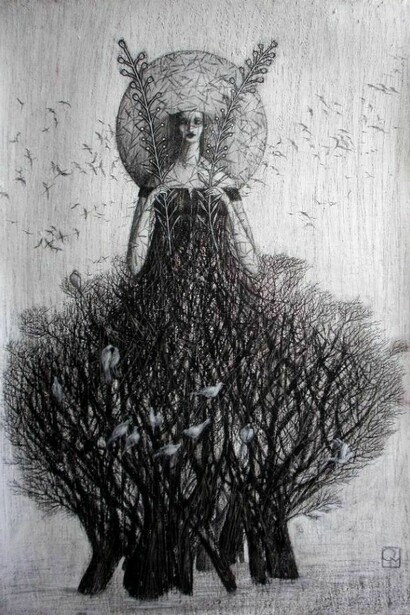 Tra bianchi acrilici, pastelli, carte tagliate in fili sottilissimi per le ramificazioni e inchiostro per la scrittura, si incontrano, così in questa mostra, le Donne Albero di Octavia Monaco: ninfe, driadi, cortigiane per metà sciamane per metà dee, che, sospese tra fisico e metafisico, in una sorta di ipnosi vegetale, si muovono vestite di un bianco sul punto di liquefarsi in luce, dissolvenza, questa, che per alcuni è propria dell’anima quando si fa visibile.