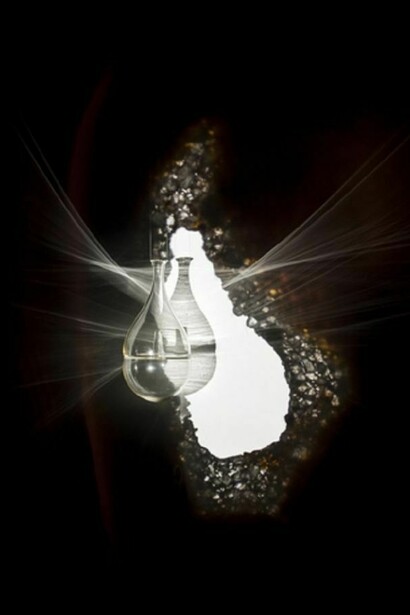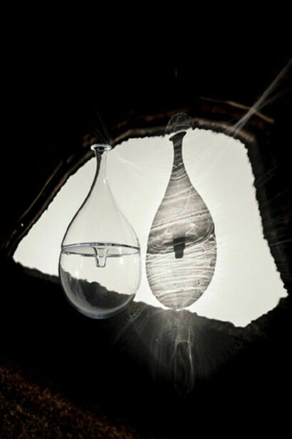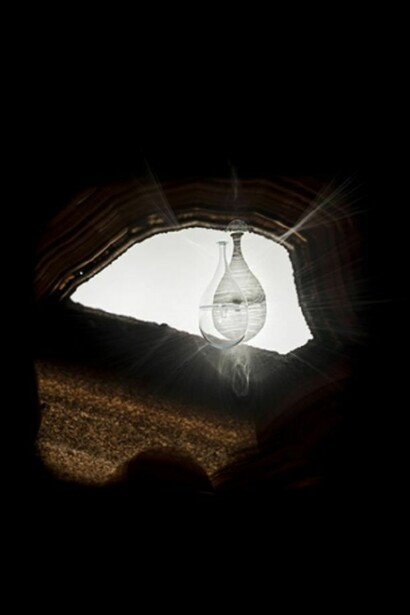 La Terra immaginata da Dante si trasforma in due bottiglie di vetro soffiato – riprese deformate, ma ancora riconoscibili, del modello Inferno-Purgatorio – che a sua volta si trasformano in ombre: due potenti lampade ne proiettano le forme sulle pareti. Da notare che l’artista ha usato come maschere per sagomare la luce, due sezioni di agate con un foro centrale: la forma irregolare del foro fa apparire le ombre delle due bottiglie sospese in una sorta di caverna – ancora una volta, l’archetipo platonico del luogo dell’illusione.
