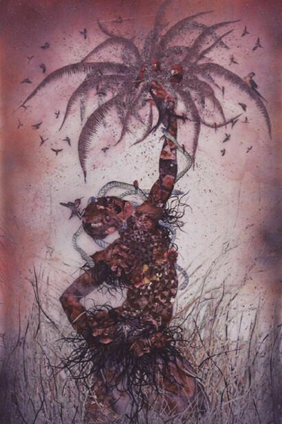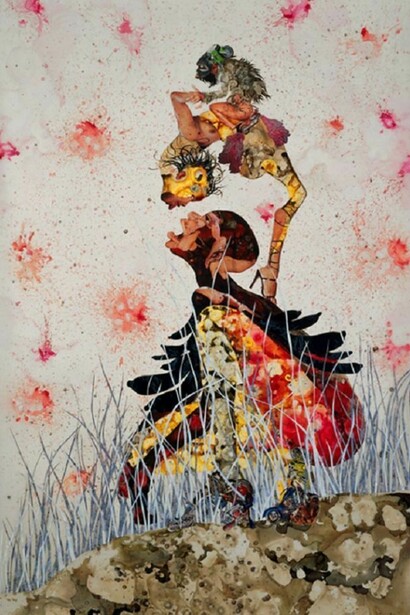 Le figure appaiono come piante fluttuanti, i pattern dei corpi ricordano i tipici tessuti africani, le teste sproporzionate sottolineano il conflitto tra l’identità interiore e le apparenze esteriori. Gli sfondi dei collage richiamano lo spazio, i corpi celesti e i paesaggi sottomarini. Le immagini, apparentamente molto decorative, celano discorsi critici sulla politica dell’immigrazione, della colonizzazione e la condizione della donna nella società contemporanea. Infatti, le donne-animali si presentano in posizioni di guerriere, come manifestanti per una causa e in qualche modo in continuo movimento, contrario a quanto un collage statico potrebbe evocare.