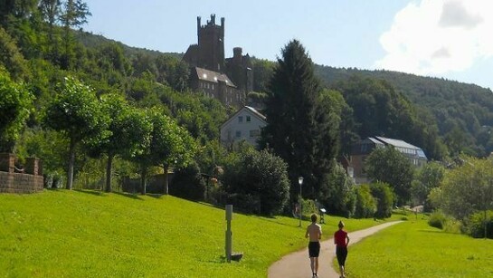 A Neckargemund, dopo 10 km dalla partenza, passo sul lato destro del mio percorso. Poi sotto il piccolo paesino di Dilsberg, arroccato su uno spuntone di roccia. Pochi chilometri e sono a Hirschhorn a percorrere la parte interna di un'ansa strettissima del fiume. Questa è la regione del Hessen, la più grande regione viticola della Germania. Sparse nella campagna alcune grandi costruzioni simili a delle piramidi di 3 o 4 metri di altezza mi incuriosiscono. Un cartello all’accesso di una scala in ferro che porta alla sommità reca scritto in tedesco “Protettorato Acquatico”. La mancanza del contachilometri non mi fa stare bene! Ho necessità di sapere quanti chilometri ho percorso, per poi pianificare le tappe successive del viaggio, quindi devo necessariamente tentare di ripararlo o, in alternativa, alla prima città comprarne un altro. In un piccolo giardino all’uscita di un single track, mi fermo in un chiosco per una pausa con torta e caffè e ne approfitto anche per tentare, con successo, di ripararlo. In breve eccomi a Eberbach tra le colline del Odenwald. La città sorge sull’altro lato del Neckar. Qui a Eberbach un'abbazia fu set cinematografico per alcune riprese del film Il nome della rosa. Poco dopo passo per Rockenau e vicino a Bad Wimpfen, che è definita una città delle fiabe, con i vecchi edifici straordinariamente conservati. Ma decido di non compiere questa deviazione.
