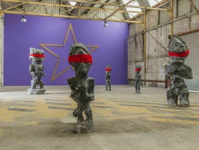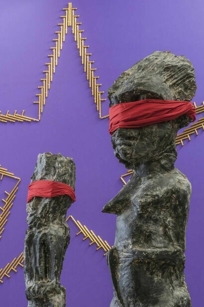 Le figure accecate rivelano la protesta; l’arte di Kendell Geers si è fatta vittima di una violenza di stato che riduce al silenzio gli artisti sparando sulla loro immaginazione a colpi conformità. Le bandiere rosse non solo manifestano il sostegno politico di Kendell Geers mostrando che non tutti sono ciechi ma testimoniano anche la sua fede senza compromessi nel potere infinito dell’arte e degli artisti.