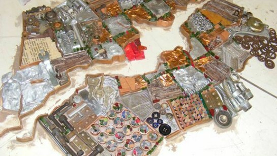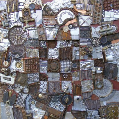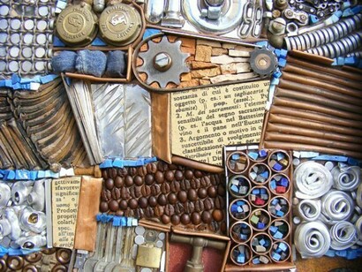 La mano sapiente di Ivan Tozzo, che divide il suo percorso creativo tra il mosaico classico, studiato alla scuola di Spilimbergo e quello contemporaneo, sceglie gli oggetti sparpagliati sul suo tavolo come chiodi, pezzi di ferro, forchette, scampoli di tessuto, tubetti di colore, materiali, spesso cercati e trovati anche nelle discariche o tra le cose da buttare per dargli una rinnovata dignità estetica.