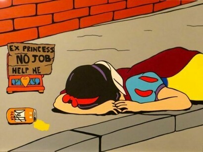 E poi la sfilata delle favole si allunga, i cattivi rubano la scena e diventano i protagonisti indiscussi. Ecco allora spediti ad Alcatraz o in qualche altra prigione Pollon, o i nani, Biancaneve sotto LSD parlare con gli uccellini. Streghe avvezze al vizio, principesse disoccupate e fallite, principi azzurri ai quali van bene tutte purché respirino, il vero amore è finito in archivio come tutti i buoni propositi. Bukowski si farebbe un tiro di sigaretta e approverebbe.