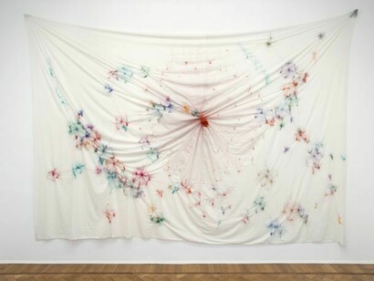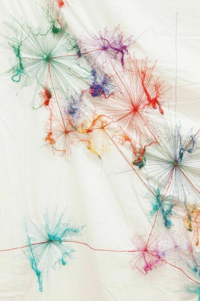 Migliaia di piccole montagne compongono un paesaggio-puzzle da risolvere in continua evoluzione. Costellazioni antropomorfe cucite nella stoffa rievocano una danza incessante, altre, lunghissime, seguono le anse di un fiume apparentemente esotico; una montagna di rame pieno passa di mano in mano come una domanda scomoda e senza risposta, una grotta rivela le tracce del passaggio di un fuggiasco, o del rifugio di un vecchio dio. Questi alcuni indizi sui lavori che sono esposti.