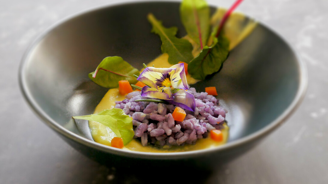 In una padella antiaderente piuttosto capiente versiamo l’olio extravergine di oliva e un paio di rametti di rosmarino. Scaldiamo l’olio e aggiungiamo poi il riso che abbiamo precedentemente lavato sotto acqua corrente fredda. Giriamo con mestolo di legno e via via aggiungiamo un po’ di brodo. Mettiamo a cuocere i mirtilli in una padellina con 200 g di acqua. Portare a bollore. Noterete piano piano che il liquido assumerà sempre più un colore viola scuro. Non fate prosciugare l’acqua. Poi frullateli. A 5 minuti circa dalla fine di cottura del risotto aggiungere i mirtilli frullati e terminare la cottura mescolando bene sempre con il mestolo di legno. Scaldiamo la purea di patate alla curcuma. Per l’allestimento del piatto alla base mettiamo la purea di patate poi sopra adagiamo il risotto ai mirtilli e rosmarino.