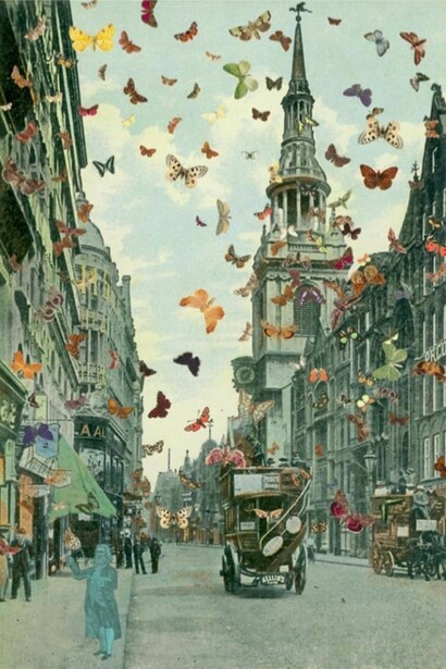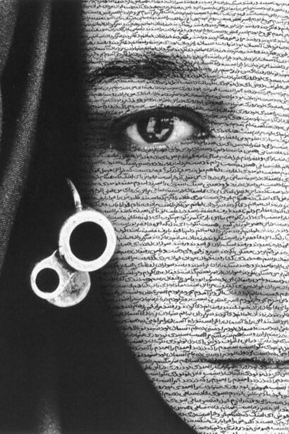 Arthur Duff invece si diverte a proiettare con un laser, parole in corsivo dal colore rosso flash che si muovono su una parete bianca, who see him, leaving, J, S, alone, in space, in total, stillness, see someone, far off, in the distance. Barbara Probst propone diversi punti di vista, fotografando quattro diverse prospettive di un unico evento. E ancora Peter Blake ci propone L’uomo farfalla, 2010, un uomo sognante capace di emanare tante farfalle color pastello libere in giro in uno spazio urbano, la donna di Shirin Neshat invece è un grande ritratto fotografico silenzioso, in bianco e nero, ricoperto da cima a fondo di scritte, di parole arabe: il titolo è Senza parole, del 1996. Il silenzio della Neshat, è un silenzio che urla e denuncia, e di urlo si parla anche nell’opera di Günther Schrei del 1991, Urlo Bianco, una grande tela costellata da una tempesta fitta e vorticosa di chiodi, contaminati da una colata di pittura total white densa, che fa male allo sguardo pungendolo.