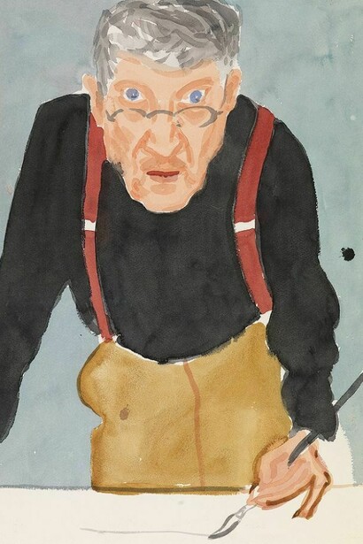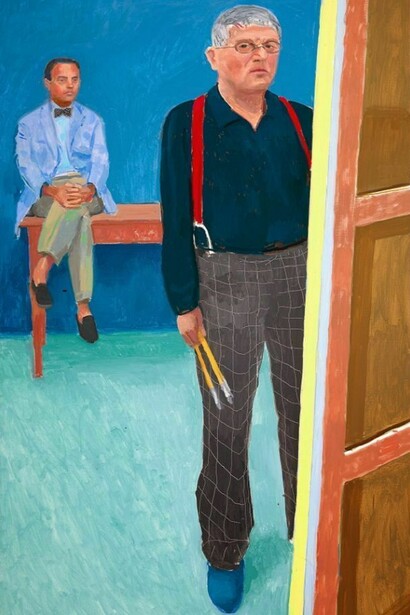 L’andamento della mostra, organizzata prevalentemente in ordine cronologico, mantiene lo spettatore in uno stato di attenzione costante, impossibile non cedere agli stimoli e ai forti impatti visivi, le opere, la maggior parte in scala monumentale, sono collocate in stanze tematiche di contrasto. La mostra si apre con una serie di acquerelli raffiguranti autoritratti, ritratti, nature morte e vedute dalle finestre. I ritratti di Hockney presentano allo spettatore amici, familiari e colleghi; ama dipingere le persone che conosce bene, anche più volte, in modo da catturare negli anni i cambiamenti di personalità e dei tratti del volto. Le emozioni certamente più tenere si percepiscono nei ritratti dei familiari. Spicca nella prima sala il suo Autoritratto con bretelle rosse che mostra lo sguardo penetrante e attento dell’artista pronto a scrutare lo spettatore e a cogliere la personalità di chi guarda.