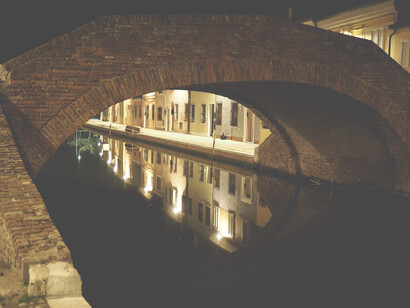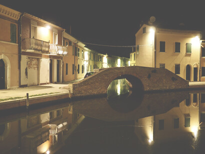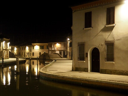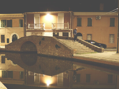 Camminando guardo in su, devo stare attento a non finire in uno dei canali di Comacchio, dove l’acqua immobile sembra cielo rovesciato. Salgo pochi gradini ampi e bassi di un ponte con una bassa balaustra in mattoni rossi. La piccola città è tutta per me... lampioni accesi che si specchiano e qualche finestra illuminata. Dall’altro lato del canale un uomo è accompagnato da un cagnolino minuscolo e tondo. Mi siedo sulla balaustra e prendo il binocolo, la macchina fotografica l’ho già al collo. Rivolgo lo sguardo oltre la fine del canale, dove scompaiono anche le poche luci dei lampioni inghiottite dal buio immobile delle valli.
