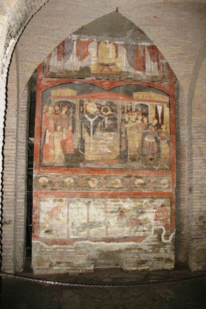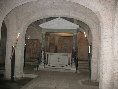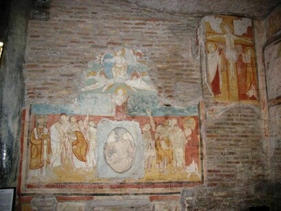 La basilica è costruita su tre livelli: il primo di essi è il più recente e risale al XIII secolo. Nell’abside si può ammirare uno dei mosaici più interessanti e significativi di Roma: su uno sfondo dorato, da una Croce partono rami di vite ed un fiume, a simbolizzare il cibo spirituale all’umanità. Dopo aver superato la sagrestia, attraverso ampie scalinate si scende al primo livello inferiore: stiamo nella basilica originale, costruita alla fine del IV secolo della nostra era (385 d.C.).