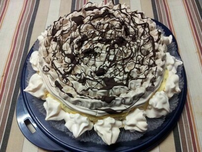 Una volta pronti i dischi e le meringhe si possono conservare in un sacchetto di carta o in una scatola di latta anche per mesi! E quando voglio fare un figurone... in un attimo faccio la meringata così: preparo una farcia usando come base un tuorlo d'uovo montato con lo zucchero che aromatizzo o con un po' di marsala o con un caffè e unisco a un quarto di litro di panna montata e rendo golosa con delle scaglie di cioccolato o della frutta secca (uvette o frutti di bosco) e con delle briciole di meringa. Su un piatto che possa andare in freezer metto un disco di meringa, la farcia e il secondo disco di meringa, livello il contorno e lo completo con le meringhe, sopra a tutto lascio colare a filo del cioccolato fondente fuso o decoro con dei fruttini rossi. Lasciare in freezer minimo due ore prima di servire.