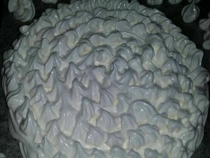 E ora la cottura, che è il momento più delicato, anzi non è corretto chiamarla "cottura" perché la meringa deve solo asciugare e non cuocere: per questo motivo il forno non deve mai superare i 90 gradi e ci vorranno almeno due/tre ore perché siano pronte, durante questo tempo il forno si può tranquillamente aprire e si possono persino tirar fuori le teglie e togliere le meringhe a mano a mano che sono asciutte, ovviamente le più piccole faranno più in fretta mentre il disco "doppio", quello coi ciuffetti sopra, ci impiegherà molto di più. Sergio le lasciava in forno per l'intera notte a 50 gradi....
