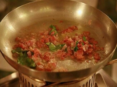 Soffriggere la cipolla in olio d’oliva, aggiungere la pancetta fresca e rosolare bene, unire a questo punto il pomodoro fresco, il peperoncino e il basilico e far tirare la salsa per qualche minuto. Versare gli spaghetti bene al dente e far legare la salsa. A questo punto spegnere il fuoco e aggiungere parmigiano e tuorli d’uovo amalgamando bene il tutto, servire ben caldo.