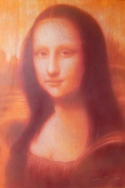 - Luca Battiston, Gioconda rossa, 2013, carta vetrata, brusca d'acciaio, imprimente per legno, 53 x 45 cm