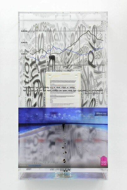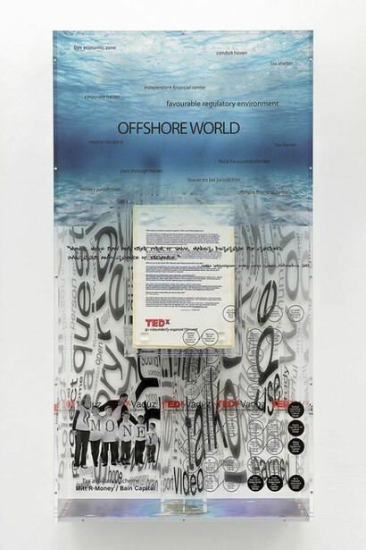 - 6 Simon Denny, TEDxVaduz Atmospheres: Offshore World (Herregraven), 2014, digital print on plexiglass, stage design images, successful TEDx application iced on display cake / stampa digitale su plexiglass, immagini del progetto per il palcoscenico, torta da esposizione con lettera di ammissione a TEDx stampata su glassam, 100 x 53 x 20 cm, Unique