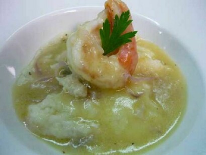 Ponete al centro del piatto il coppa pasta, inserite dentro una prima fetta di mela arrotondata, una parte del composto di seppie e mela, un altro disco di mela, ancora dell’altro composto e chiudete con il terzo disco di mela. Una leggera pressione con le dita compatterà il vostro preparato. Con un sacco a poche formate nel piatto tre corone a triangolo con il formaggio fresco aromatizzato. Friggete in olio extravergine d’oliva aspromontano i gamberi e poneteli sulle corone con il codino all’insù.