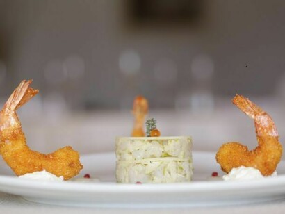 con Mela Verde di Bova e tempura di Gambero Mediterraneo al Mais su mousse di Frescolatte.