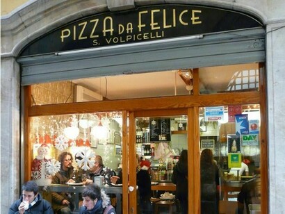 Con il che chi scrive ha dimostrato che la vita è un velo di maya e che l'universo tutto ruota intorno a un asse che in un tempo più o meno variabile torna sempre a occupare la medesima posizione. Quand'anche foste una Madame Buzzacchiotti maritata a Monsieur Perep Epeé e, ritenuto essenziale al vivere mantenere sano il rapporto di coniugio, invece di mettere al macero le lonze in un bagno di fieno e fiordalisi e mangiare fettuccine di cotognato, portatevi al guinzaglio il coniuge verso Lucca città di barattieri. Procurate magari di arrivare dalla via del Brennero costeggiando il Serchio e gli orti ubertosi della campagna circonvicina. Una volta esisteva in riva al fiume una sublime locanda dove avreste potuto mangiare un frittino di pescatelli, pescetti di fiume che venivano serviti in un cono di carta gialla profumata di fieno e un bicchiere di rosso corposo. Ma occorre rassegnarsi al degrado e all'imbarbarimento dei tempi e reclinare il capo al volgere malvagio delle ere verso il caos. Per cui a Lucca in una stradina stretta del centro storico, dove arriverete traccheggiando sul sagrato della chiesa di San Michele a ammirare i mostri della facciata romanica, mangerete una pizza. La mangerete in piedi perchè la Pizzeria da Felice occupa la stessa stanzetta di pochi metri quadri da subito dopo la seconda guerra mondiale. Il locale seppure angusto è regolato da un ferreo matriarcato che sembra riprodursi per partenogenesi. C'era una volta dietro il banco una donnina deliziosa, di quelle fatte di ferro, Pasquina Malanca. Poi sempre in linea matrilineare si sono avvicendate figlie e nipoti che evidentemente si tramandano il segreto della magica pozione che rende la loro pizza un'esperienza dionisiaca. Procurate anche qui di andare in orari alternativi perchè la fama del locale lo rende spesso impraticabile. Del resto qui si mangia anche la miglior cecina che mente umana possa concepire, sottile e croccante con una segreta morbidezza che non si spiega se non con la presenza di una benevola entità che presiede e infesta il forno a legna. La nostra Madama Buzzacchiotti in Perep Epeé si farà confezionare un generosa dose di tutto, non ultimi i necci con ricotta cotti a legna, e si trascinerà il marito verso le mura a passo di trotto per non far freddare nulla. Sulle mura a cinque minuti cinque di cammino avrà mandato uno scherano a tenerle libera la panchina che domina dall'alto il perfetto giardino barocco di palazzo Pfanner. Ponga il marito seduto rivolto verso la bella fontana che sembra emettere spruzzi d'argento. Porga al Monsieur un fetta della pizza paradisiaca e faccia altrettanto. Condividere un momento del genere dovrebbe garantire un tagliando matrimoniale quinquennale. Se così non fosse il guasto sta nel marito, perchè la pizza sarà certamente perfetta.