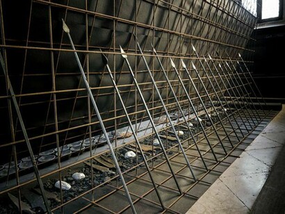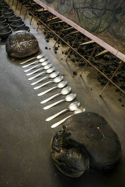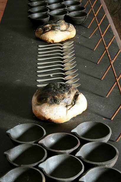 Per dare forma a uno austero rito conviviale, Franca Ghitti raccoglie e organizza, in un ordine geometricamente calcolato, elementi e materiali diversi, come scarti della lavorazione del ferro, la rete metallica, frammenti di carbone, coppelle in ferro contenenti granaglie varie, pagine e libri chiodati, sbarre, lance, ritagli e polvere di ferro, che segnalano drammaticamente il presagio e i simboli della passione.