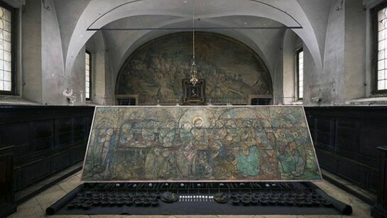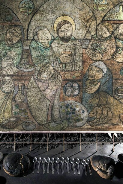 Una serie di pani rotondi, posati ai piedi dell’altare o tra le sbarre di ferro che sostengono il dipinto, le 12 posate dei convitati perfettamente allineate, a fronte dell’immagine effigiata 50 anni prima, sono tutte presenze evocative e modi che a distanza di millenni ricostruiscono un evento che appartiene profondamente alla nostra cultura.