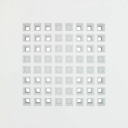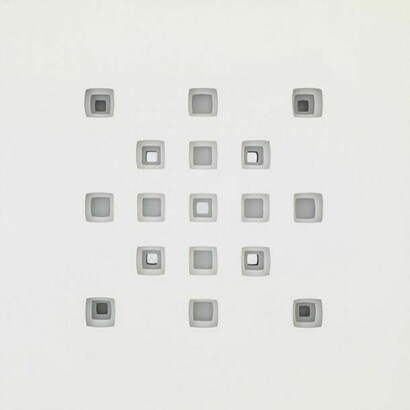 L’opera di Vanna Nicolotti sembra percorsa da una mobile vibrazione energetica. Anche i lavori più recenti, da Struttura variata (2012) a Ricordando Salomone (2012), hanno una qualità sussultante, prodotta dall’impiego del metallo anodizzato che produce effetti cangianti, infondendo le cavità e le griglie d’una luce tremula, pulsante. Questa sorta d’irrequietezza formale si esprime anche attraverso la predilezione per forme che alludono all’incognita matematica (x), espressione del carattere fondamentalmente dubitativo delle sue opere. D’altra parte, i lavori degli anni Settanta della serie Testo a fronte, formati da parole con caratteri a rilievo e immagini astratte che ne ricalcano il significato, altro non sono che interrogazioni sul senso stesso del linguaggio. E lo stesso si può dire dei recenti Punto Interrogativo 1 (2012) e Punto Interrogativo 2 (2012), che inducono lo spettatore a riflettere sul valore enigmatico dello spazio, da intendersi non solo come dimensione fisica, concreta, misurabile, ma anche come dominio intangibile dello spirito.