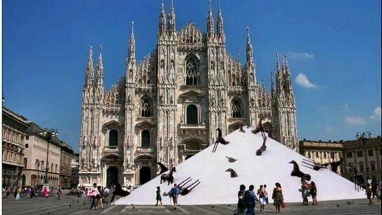 Dal 21 marzo i milanesi assisteranno a una rivelazione. Piazza Duomo sarà occupata da un immensa montagna bianca di sale. La Montagna del Sale di Mimmo Paladino. Un'imponente installazione - voluta dal Sindaco di Milano, Letizia Moratti - che verrà collocata tra la statua equestre di Vittorio Emanuele II e il Duomo, in asse con l'ingresso della Galleria. Una maestosa architettura, con un diametro di circa 30 metri e un'altezza di 20, ricoperta di uno spesso strato di sale, da cui fuoriusciranno trenta sculture (tre cavalli integri e alcuni frammenti di bronzo).