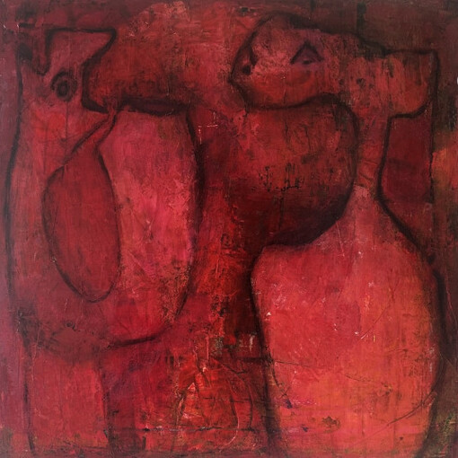 Her years working closely with herbal medicine continue to influence her sensitivity to material and process. There is patience in her approach. Layers are allowed to settle; surfaces evolve over time. She works independently and often develops her practice in series, returning to similar figures and compositional structures as a way of deepening emotional inquiry. Each painting feels like part of a larger internal conversation.