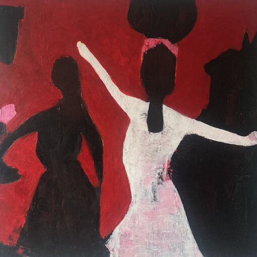 Her work moves between figuration and abstraction. Human figures appear frequently, yet they are not defined in detail. They emerge as shadows—elongated presences, softened silhouettes, forms that seem to hover between appearance and disappearance. These figures are not portraits of specific individuals; rather, they suggest emotional states, fragments of memory, or echoes of experience.